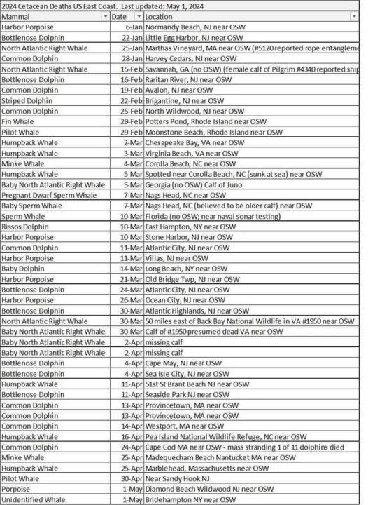 The offshore wind projects have brought little jobs and power and unprecedented harm to ocean mammals. There have been ten dead mammals where they are surveying for OSW expansion off NJ, NY, and the MA coast. The list below are over 40 dead mammals from January to May 1 2024. These are the mammals we know about. There are no studies of the effects on mammals, microorganisms, and the problem or poisons to which these giant turbines have been linked. New England is known for its seafood; be sad if it all comes from another country halfway around the world.