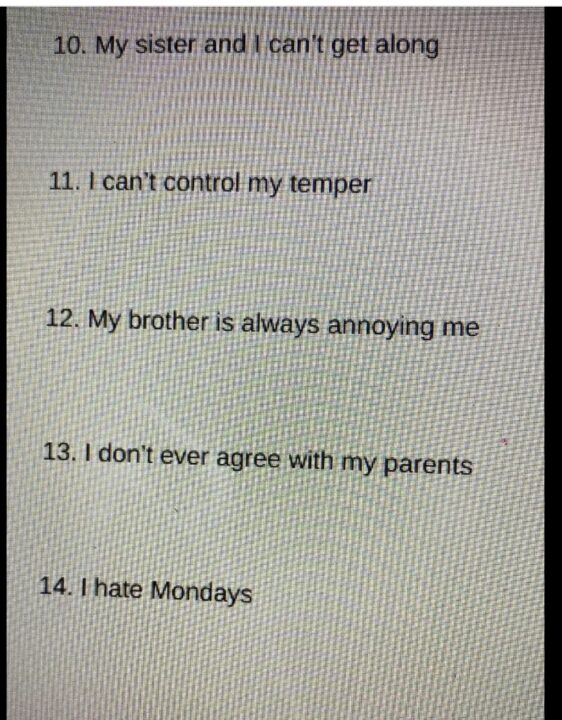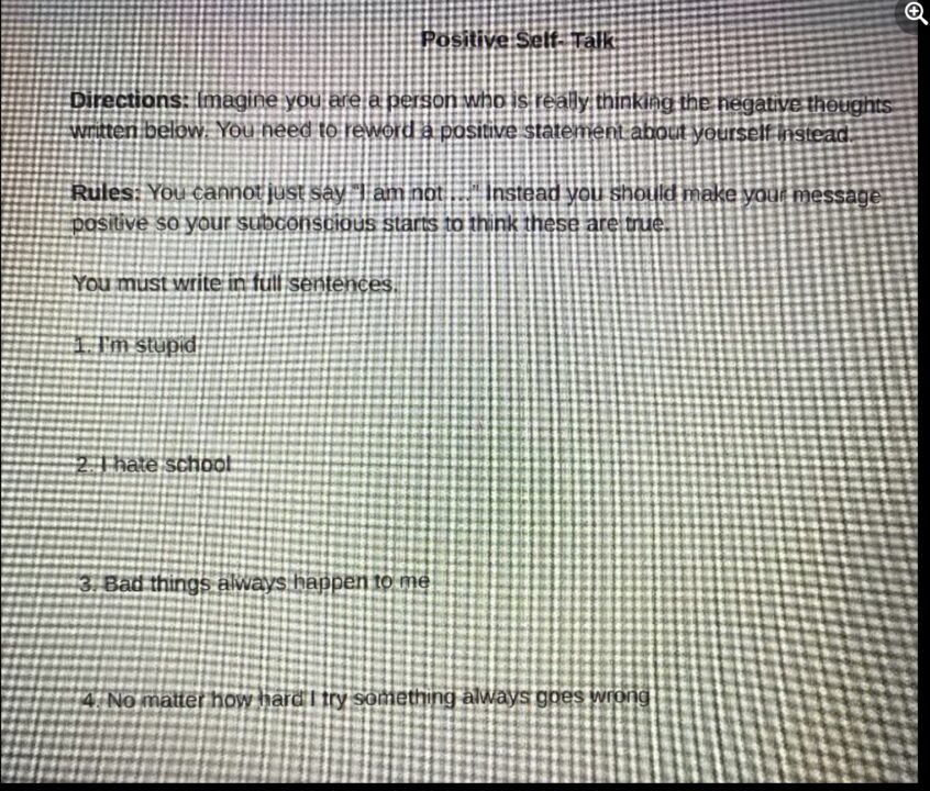 More examples of Social and Emotional Learning are in the school classroom now. Here is a psychological exercise given to middle school students in Seabrook by a health teacher. Normally, these kinds of exercises are given to individuals after they’ve been assessed by a mental health professional, not in Seabrook schools. They just hand mental health treatment over to teachers now to distribute to all of the children. It doesn’t matter if a child needs mental health treatment or not.