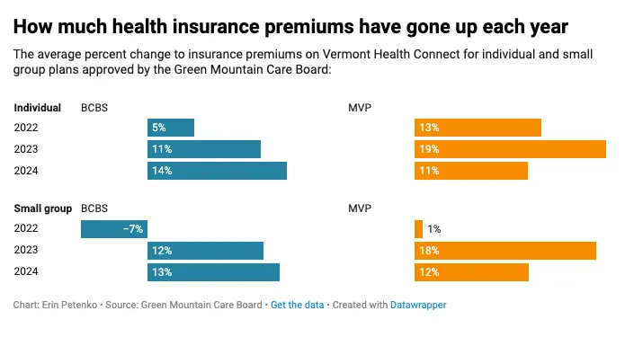 Ask people why Vermont is unaffordable, and health insurance is one of the main pillars of our unaffordability crisis, along with education property taxes, the cost of housing, and energy prices. These highly regulated by our legislature plans go up every year by amounts far in excess of inflation. For 2024 alone, the Green Mountain Care Board approved individual rate increases for Blue Cross and MVP of 14 percent and 11 percent, respectively. That was over $1000 a year on top of already high premium costs.