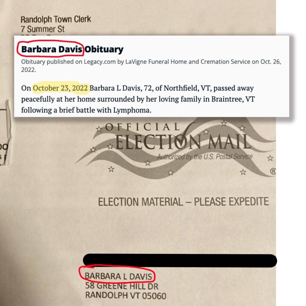 Elsewhere, a friend shared a photo of a ballot that landed in his mailbox for a woman who no longer lived there. In fact, she no longer lived period. A quick search of her name turned up her obituary, published two years ago.