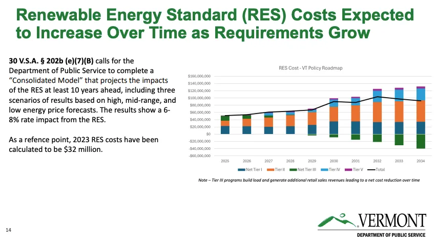 The big point of contention was over cost of the RES to electric ratepayers. TJ Poor of the Department of Public Service presented data showing that the RES added $32 million to Vermonters’ cost of electricity in 2023, and moving forward it is projected to increase rates by 6-8 percent on top of the normal market price. In total dollars, that amounts to around $50 million extra charges in 2025 rising to $90 million (net) by 2034. But Sibilia insisted that, no, the RES somehow reduced ratepayer costs.