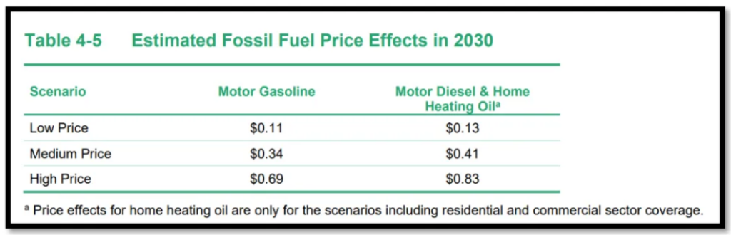 This high price scenario would mean Vermont joining the Western Climate Initiative (WCI) with California and Quebec – the only existing option — with a tax/fee/surcharge rising to 69¢ per gallon on gasoline and 83¢ for diesel and home heating fuel by 2030 (WCI is an economy-wide program also covering home heating fuels), and that would steadily rise at a rate of 5 percent plus inflation up to 80¢ per gallon of gasoline and higher for diesel and home heating fuels.