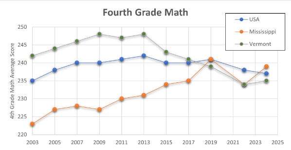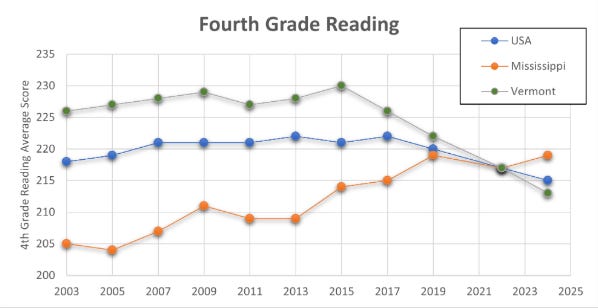 This is not breaking news but deserves repeating. Mill Moore, writing for Campaign for Vermont exposed this startling new reality earlier this month in a terrific article highlighting Vermont’s decade-long public school performance nosedive, which has coincided with an upward trend in math and literacy scores in Mississippi. Yeah, that Mississippi. The (formerly) “Thank God for Mississippi” Mississippi. The Mississippi whose students now perform better than ours.