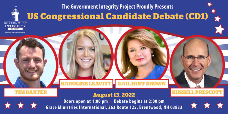 The Government Integrity Project is proud to host a FREE debate between four GOP candidates who are running to replace Chris Pappas in the U.S. House of Representatives: Tim Baxter, Gail Huff Brown, Karoline Leavitt and Russell Prescott.