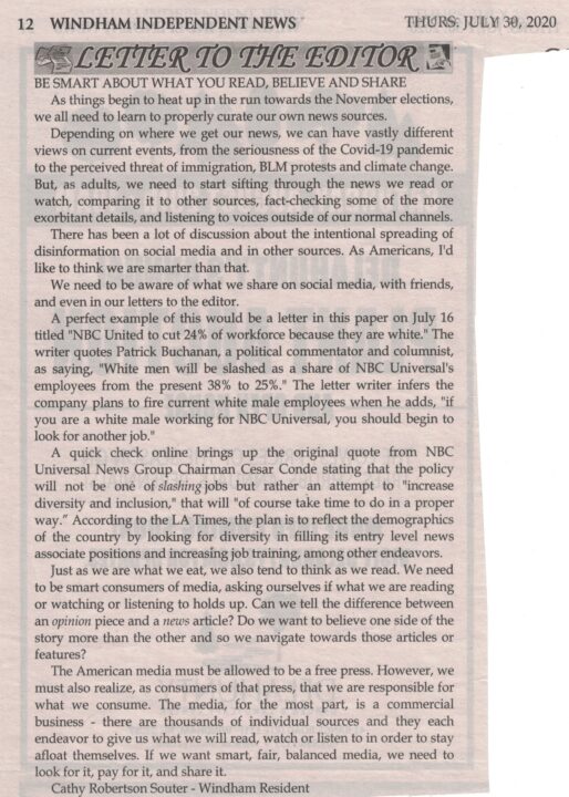 I respect the right of everyone to express their thoughts… whether they be right, wrong or misguided. That includes Windham Resident Mrs. Cathy Robertson Souter, who wrote a letter to the local Windham paper last week to warn