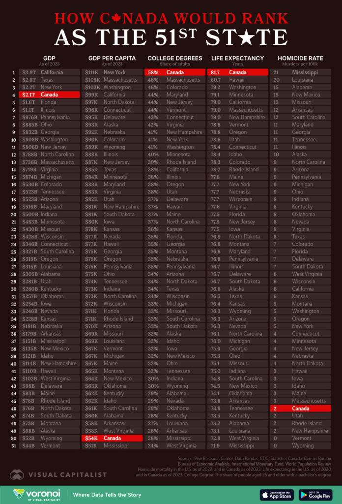 So, Visual Capitalist has, due to the politics du jour, decided to show how Canada, our possible 51st State, would shape up compared to the current US States. It would become the largest one (unless, for “political balancing” purposes, it was chopped up into several states). But what about a few other metrics?