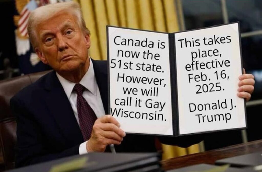Many LGBTQ+ Americans threatened to leave the country if Donald Trump were elected, often posting pictures to social media as they entered Canada. Were Trump to take over Maple-land and turn it into the 51st state “calling it Gay Wisconsin is the least I can do” he said assuring reverse asylum seekers he would make sure to keep Canada as gay as it is right now.