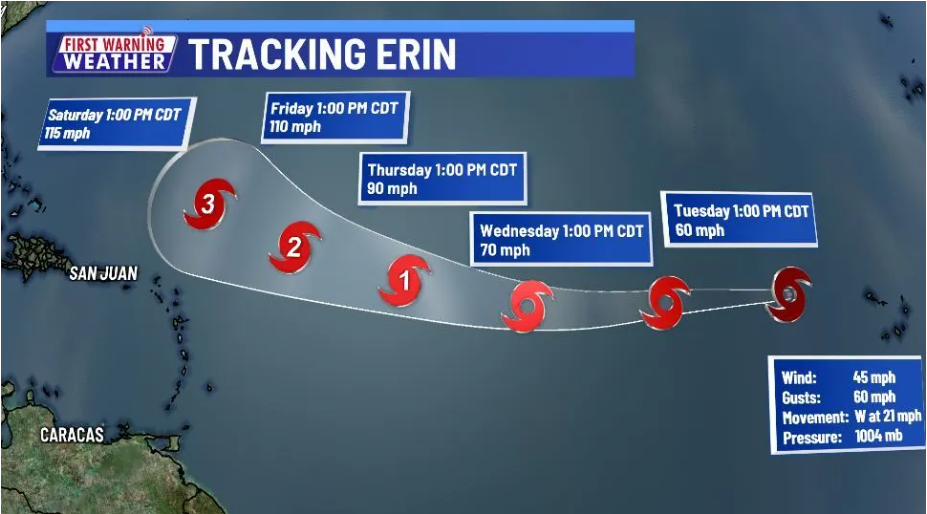 Erin is almost certainly going to be our first hurricane of 2025. The track is always suspect, but it looks like it’s coming our way.